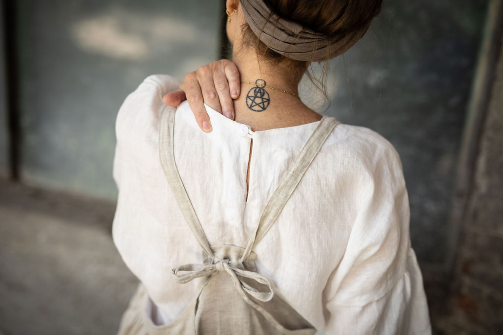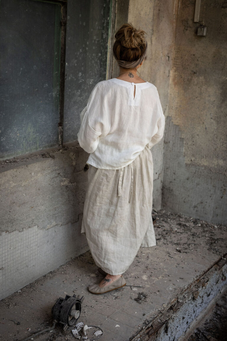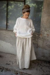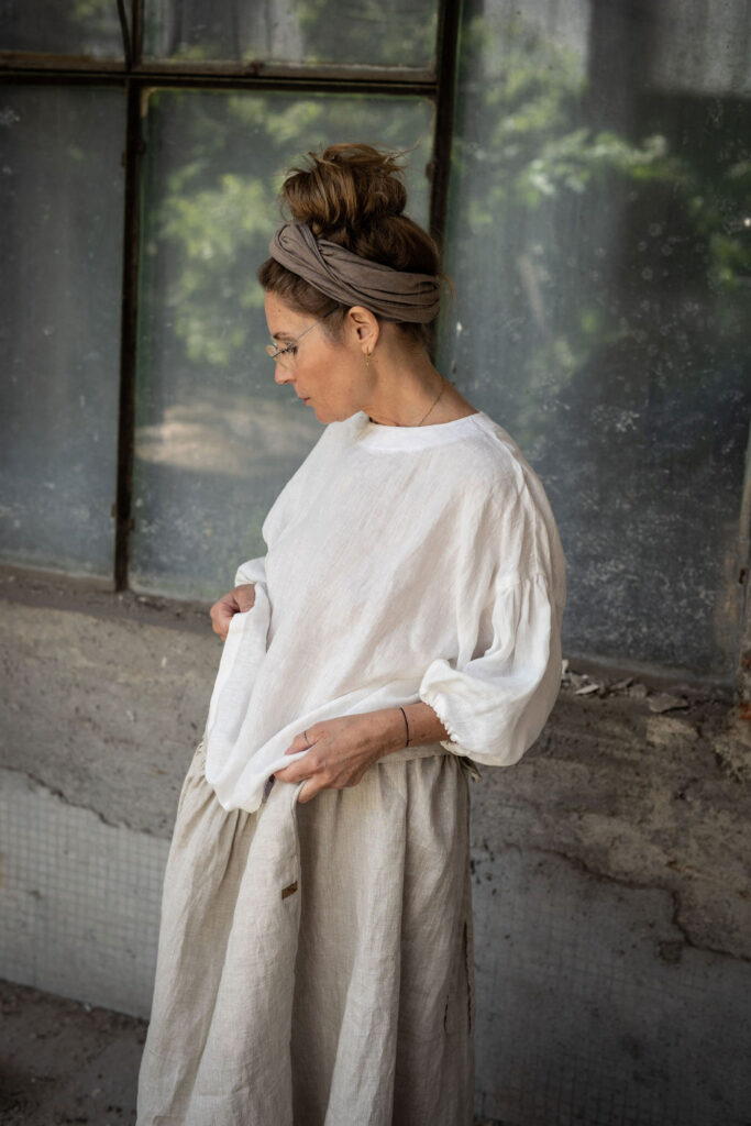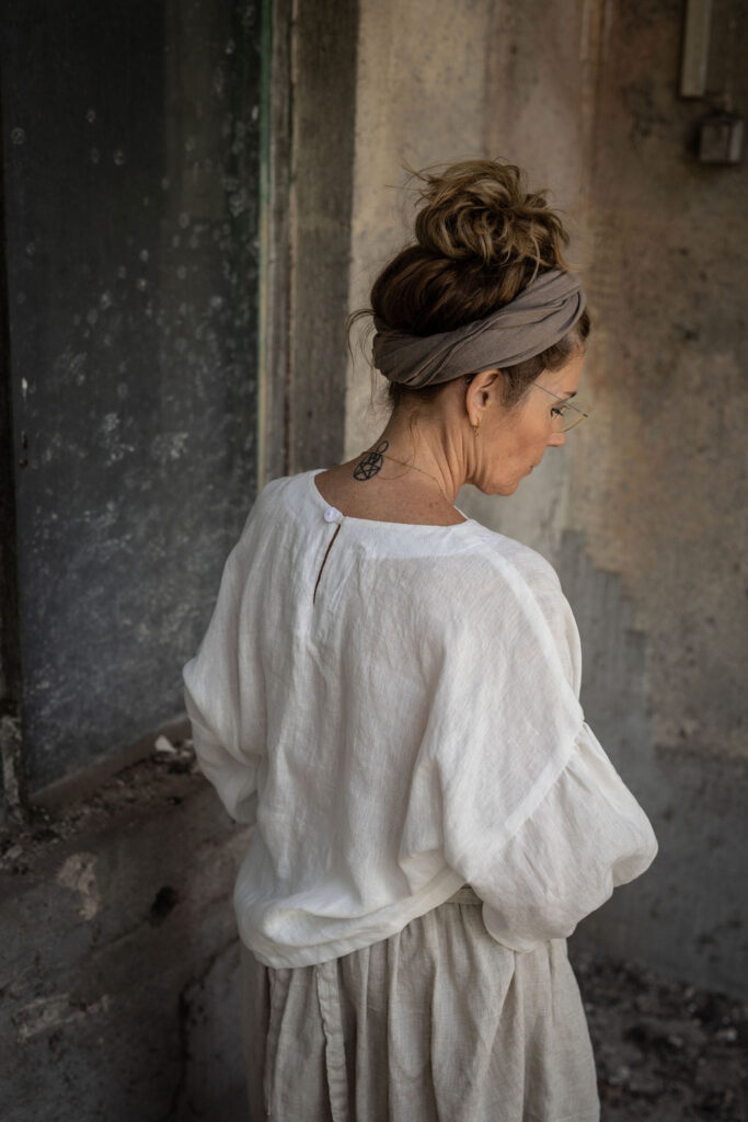 Lehká lněná košilka v barvě starobílé (přejete-li si bílou optickou, uveďte svůj požadavek v poznámce objednávky). Volný střih se spadenými řasenými rukávy v 3/4 délce. Zapínání na nitěný knoflík. Hluboké průramky. Info k rozměrům a dostupnosti níže.