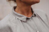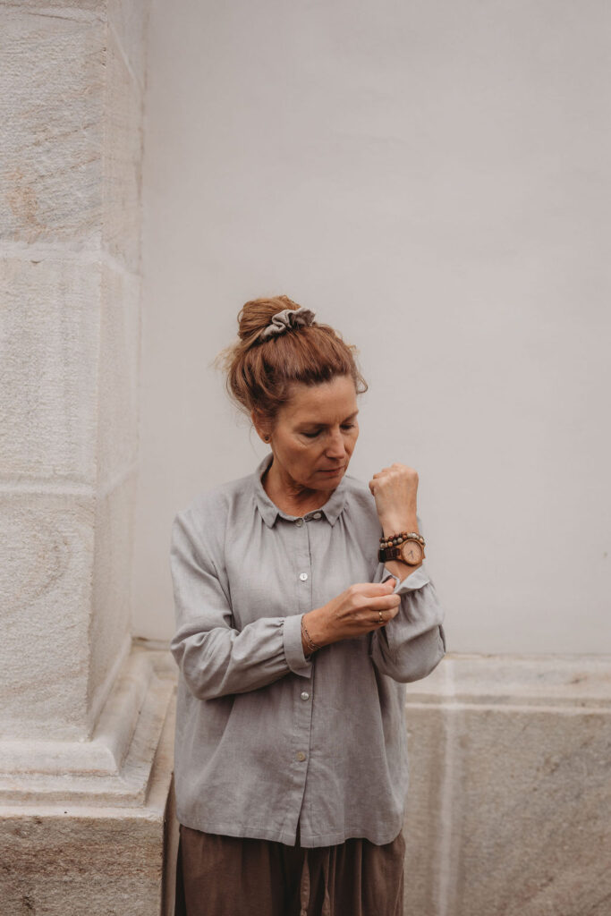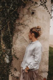 Dámská lněná propínací košile raglánového střihu. Řasení na předním i zadním dílu. Manžety k ohrnutí. Perleťové knoflíky. Ideální v kombinaci s šaty Viktorie. V základní světlešedé variantě, na přání v barvě optické bílé (nutno uvést v poznámce objednávky). Len gramáže 185 g/m2. Modelka výška 163 cm, vel. M. Dodání v rámci předprodejní akce do 3-5 týdnů od přijetí platby.