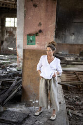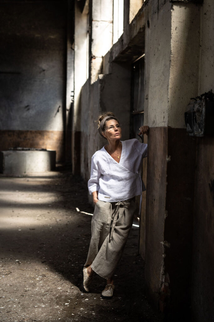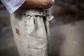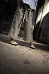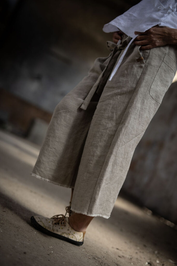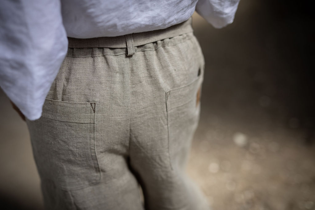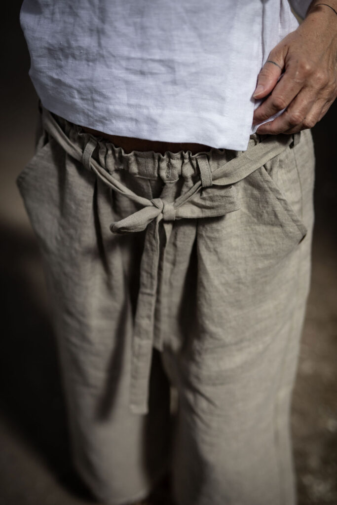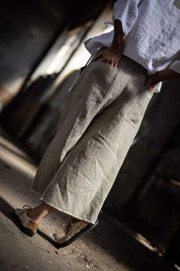 Ležérní pohodlné kalhoty v 3/4 délce, s přiznaným pevným okrajem nohavic. Z přírodního konopí či lnu. Na gumu v pase, s poutky a páskem k regulaci. S falešným zipem a sklady na předním díle. Kapsy na předním i zadním díle. Info k rozměrům a dostupnosti níže.