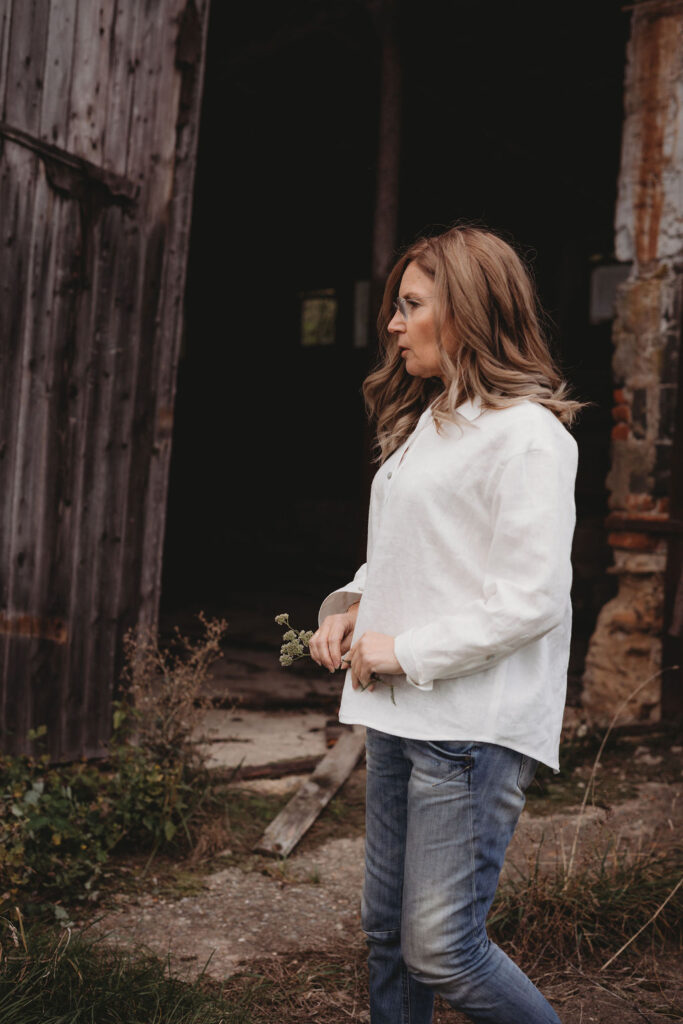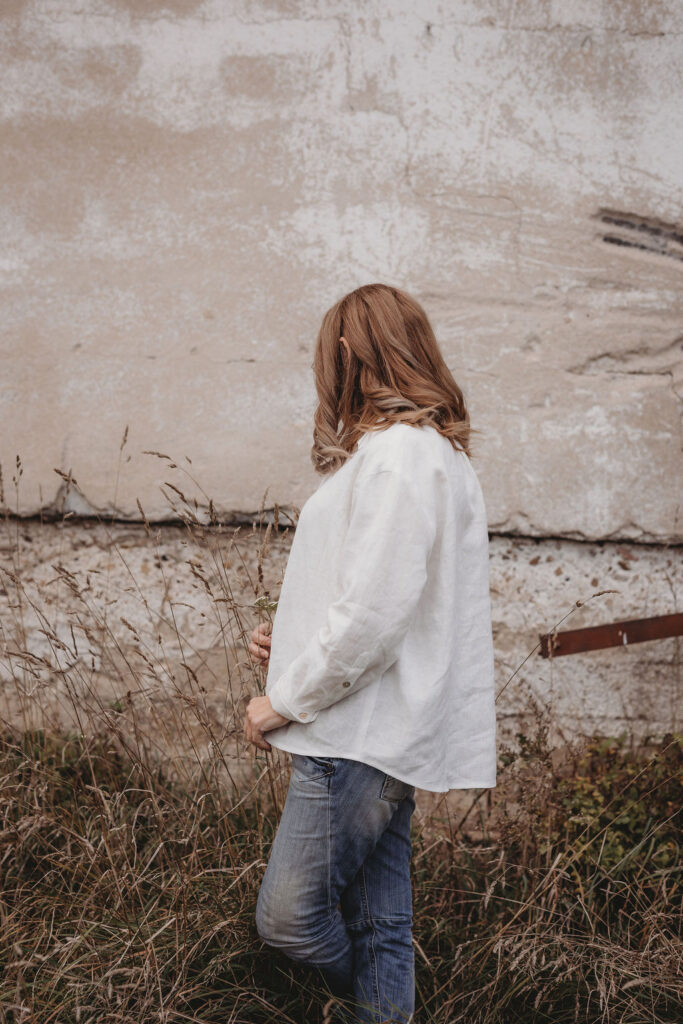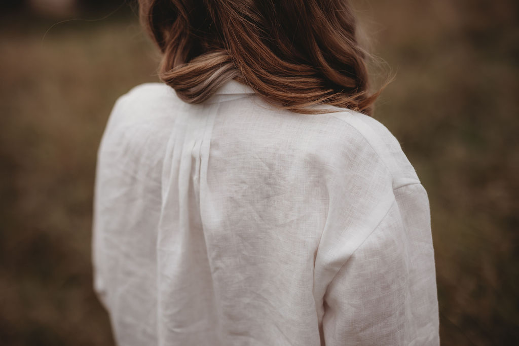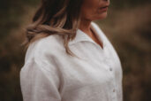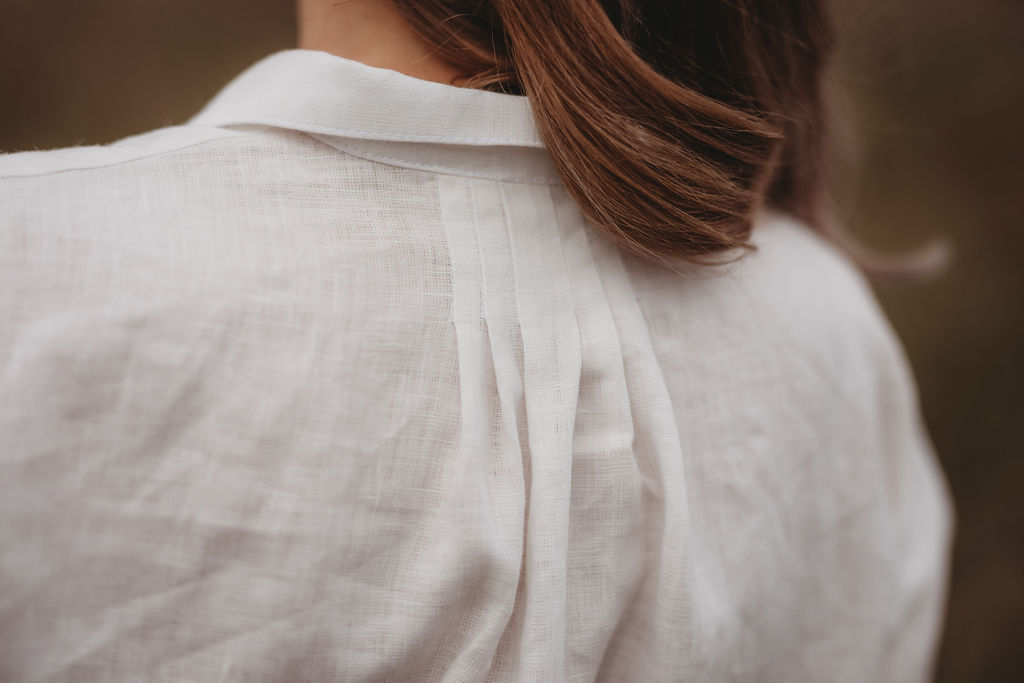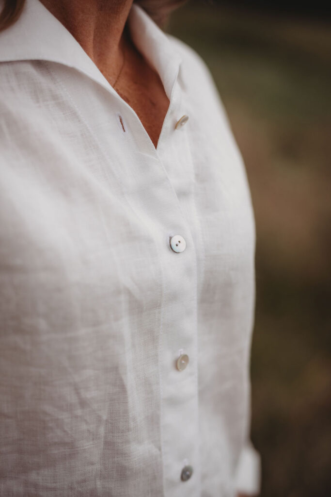 Bílá lněná dámská košile. Velmi ženský dyzajn. Ležérní límeček, sámky na zadním díle. Dlouhý rukáv s vysokou manžetou a knoflíčky. Zakulacený spodní okraj. Knoflíčky z perleti. Dodání do 3-4 týdnů od uhrazené objednávky. Více infa níže.