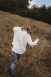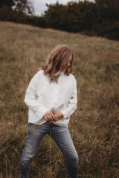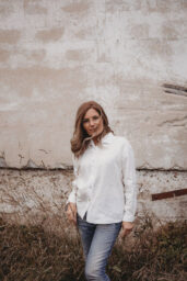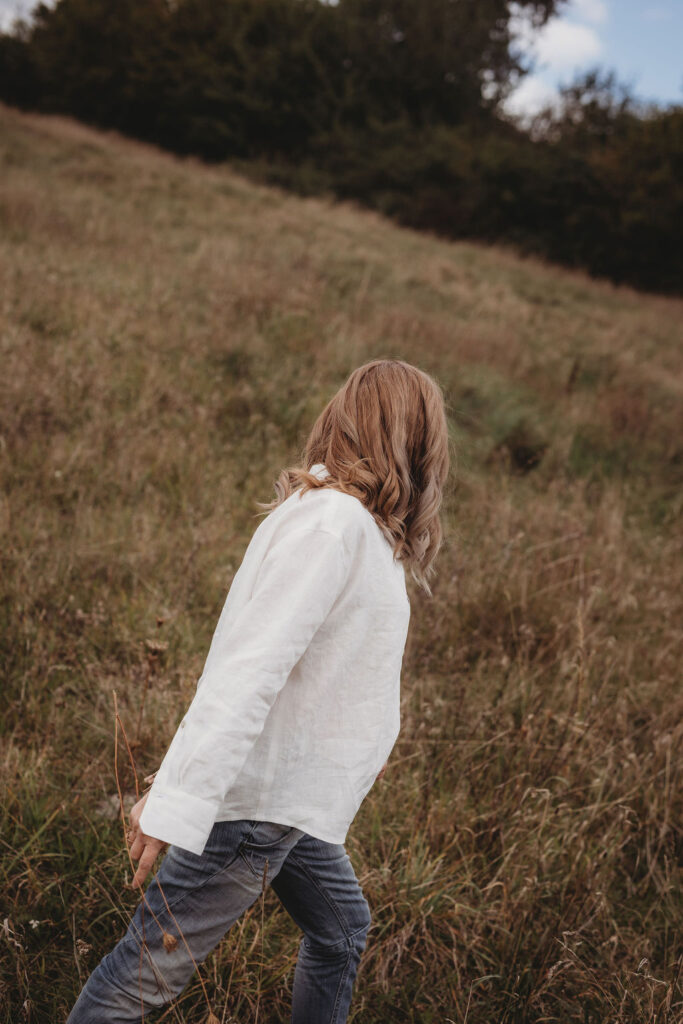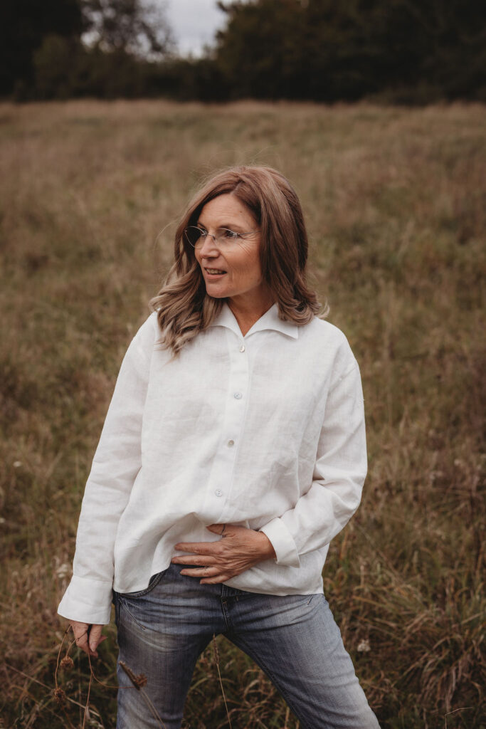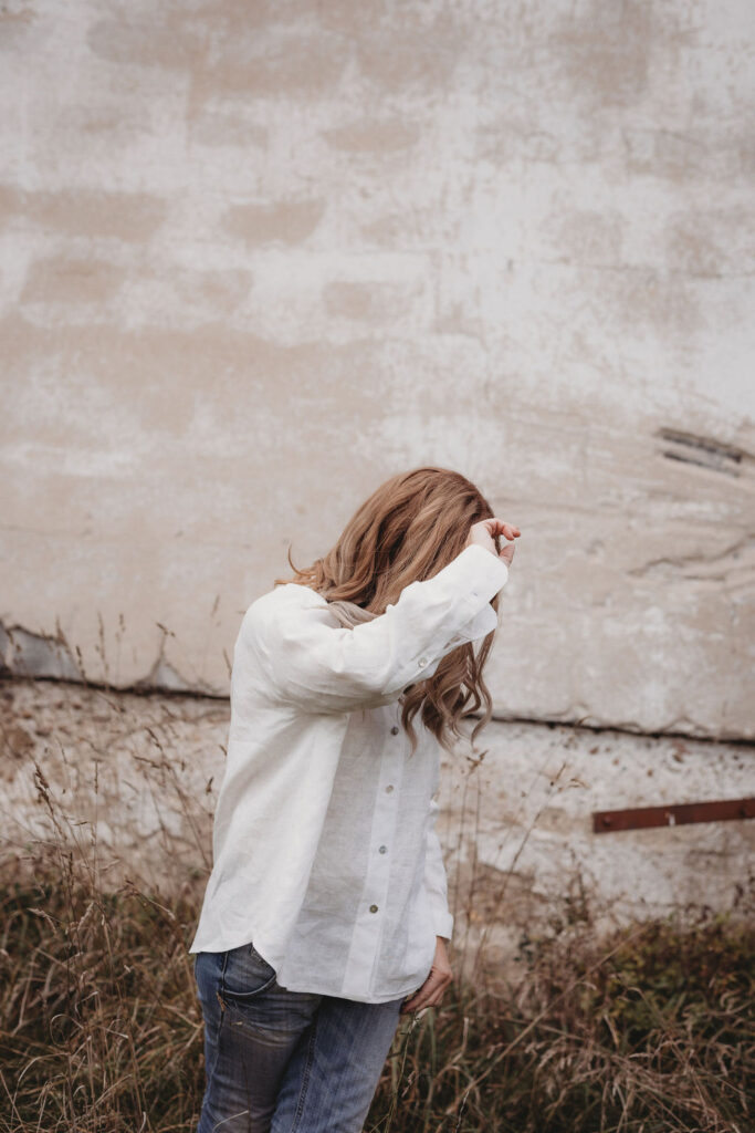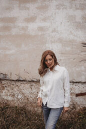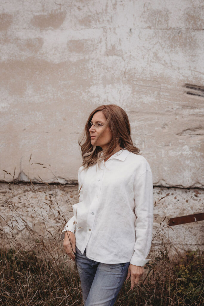 Bílá lněná dámská košile. Velmi ženský dyzajn. Ležérní límeček, sámky na zadním díle. Dlouhý rukáv s vysokou manžetou a knoflíčky. Zakulacený spodní okraj. Knoflíčky z perleti. Dodání do 3-4 týdnů od uhrazené objednávky. Více infa níže.