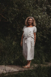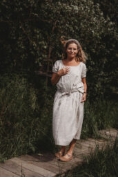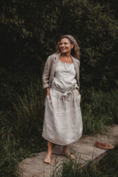 Lněná sukně rafinovaného střihu, který zajistí, že vše padne jak má. V zadní části přiléhavá, v přední se dvěma pevnými sklady. Díky speciálnímu typu úvazu se vytvoří úhledný třetí sklad a sukně perfektně sedne. Obvod pasu, stejně jako boků, je přizpůsobivý vaší postavě. V bocích pohodlné kapsy. Falešná výpustková kapsička na zadním dílu. (viz. kalhoty Vilemeens)